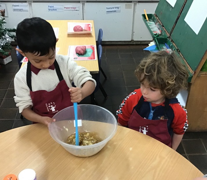 The children learnt songs and poems to share with families. They re-wrote their own version of the Little Red Hen and in their story, they made a “rainbow, raisin, chocolate cake!” The children enjoyed making banana muffins to share with our audience and they have been busy making cards and decorations. Santa’s Grotto and our nursery party provided a very exciting end to our term!