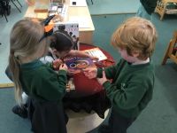 In Reception, writing and reading are at the heart of our learning. The children were very excited to find a newt in the garden so chose to write about it. Having looked at a doll from the 1950’s, the children had a go at writing about her too. Children are able to practise their next steps and phonics skills at the phonics table. Here they are enjoying the outdoor reading area as children have access to a wide range of books to enjoy.