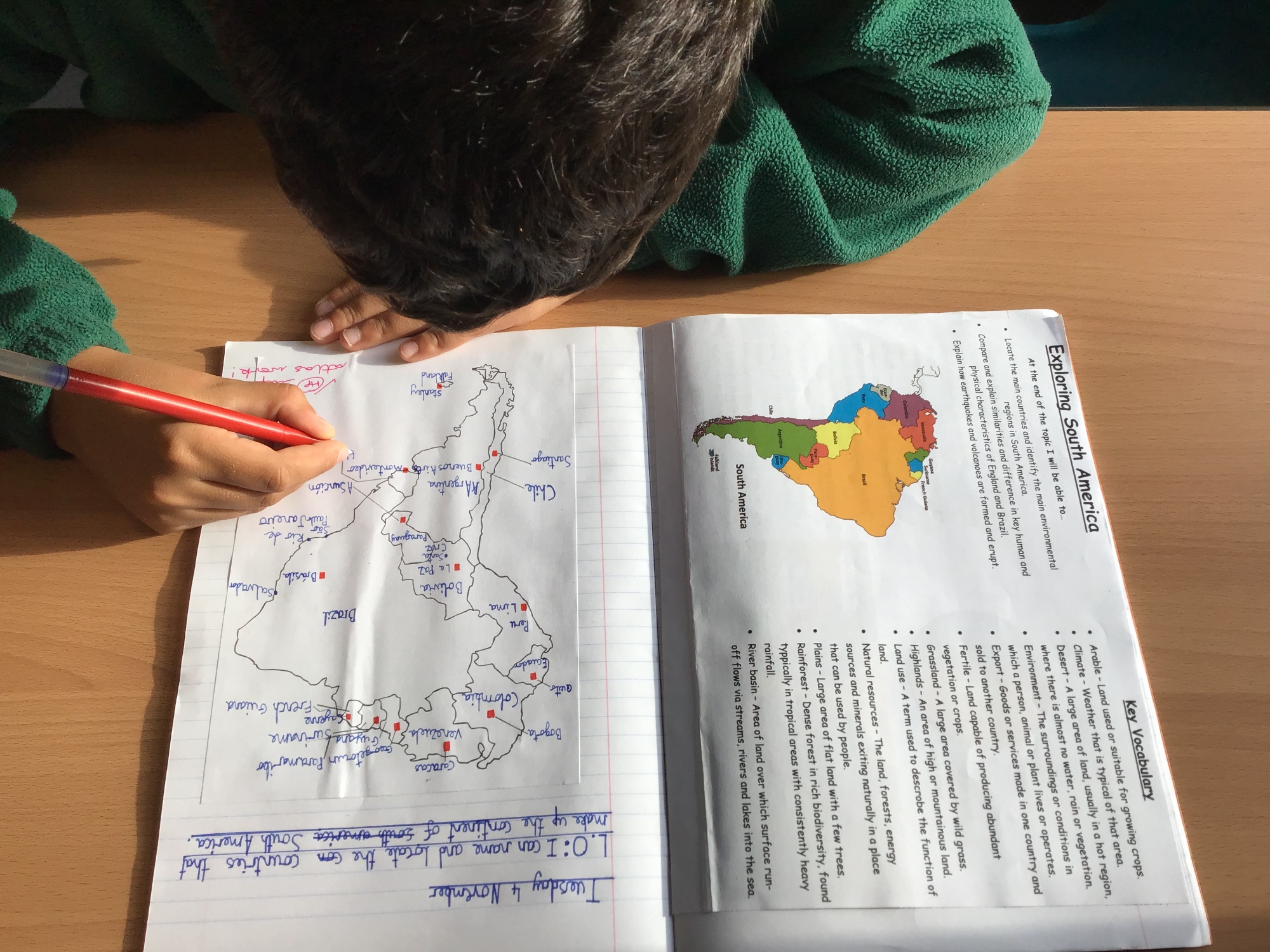 In one of our first lessons about our new topic of South America, we discussed what we already knew, what we wanted to learn before children learned basic facts about the continent and used atlases to label the 12 (really 13!) countries that make up South America as well as their capital cities.